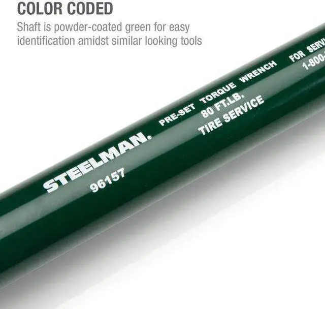 Increase technician productivity with the STEELMAN 96157 1/2-Inch Drive x 80 ft-lb Pre-Set Torque Wrench. Designed for installing wheels on motor vehicles, this wrench speeds up tire servicing operations in busy shops and automotive garages. When mechanics and service techs don't have to take time to adjust a clicker, double beam, or electronic wrench, they are able to complete the job in record time, making your shop bay available for the next job all the faster. Saving time improves customer satisfaction and puts money in your pocket. This wrench also reduces risk of wheel stud damage and loose lug nuts by ensuring the nuts are tightened to manufacturer specifications, reducing costly comebacks. This wrench's green color-coding makes it easy for technicians to pick out the correct wrench every time. A quick-release button on the back of the head allows easy removal of attached sockets and extensions. Heavy duty chromoly and chrome vanadium steel construction with protective rubber sleeves keep your wrench operating reliably, and the one-way feature ensures your valuable, precision tool, cannot be used as a breaker bar. A protective plastic storage case is included to ensure the tool will be safe from the knocks and bumps of storage that could cause a loss of calibration. Comes with a certificate of calibration.