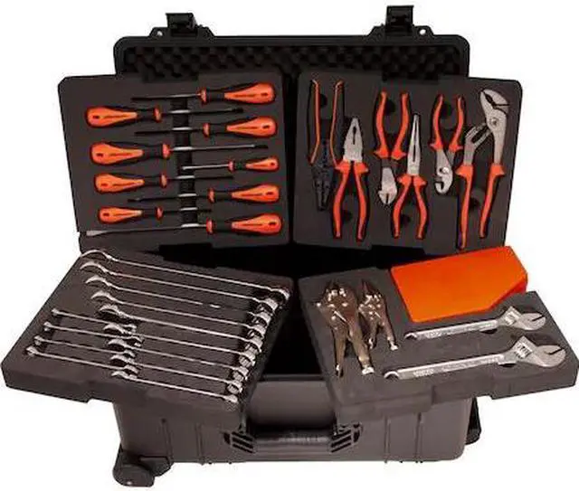 SAE combination wrench set: 1/4", 5/16", 3/8", 7/16", 1/2", 9/16", 5/8", 11/16", 3/4", 13/16", 7/8", 15/16", 1". Foam tool organizer for all tools. Mobile tool case, water-resistant, crushproof, dustproof. Meets ANSI standards.