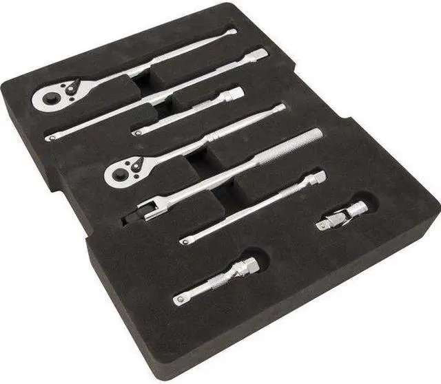 Set Includes: 3/8" Dr. 3 & 6 Extensions, Quick Release Ratchet, U-Joint, Flex Handle and 1/2" Dr. 5 & 10 Extensions, Quick Release Ratchet. Foam insert, precisely created using CNC routers, provide a tight fit for each tool in the set, keeping them neatly organised. Each tool slot is marked making tool identification quick and easy. Tool tray made using 3D design and two layers of high-density foam in contrasting colours (black and orange). The orange color acts as a visual indicator so you can spot missing tools quickly. Tray measures 11.2 (L) " X 1.5 (H) " X 13.2 (W) and fits in most standard size toolbox drawers. This Set meets ANSI standards