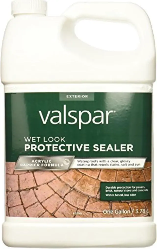 Valspar 24-82390 Gl 1 Gal Clear Wet Look High Gloss Sealer VALSPAR WET LOOK HIGH GLOSS SEALER - ONE GALLON: Valspar Wet Look High Gloss Sealer waterproofs and enhances the color and design of aggregate, masonry, brick, slate and pavers with a glossy, wet-look sheen. As durable as it is beautiful, it protects against the sun's powerful rays, damaging weather, water, gasoline and de-icing salts. === A clear waterproofing sealer for exterior aggregate, concrete, brick, pavers, masonry, mortar and flagstone == Waterproof gloss finish seals surface == Protects against UV rays and water == Ready to use == For exterior use == Approx coverage: Approximately 200-400 sq. ft./gallon == NOT for use on garage floors A clear waterproofing sealer for exterior aggregate, concrete, brick, pavers, masonry, mortar and fl , Waterproof gloss finish seals surface - Protects against UV rays and water , Approx coverage: Approximately 200-400 sq. ft./gallon , NOT for use on garage floors , One Gallon Container