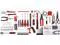 Comprehensive assortment of professional-grade wrenches, a complete range of 1/4 inch and 3/8 inch metric-sized sockets and precision screwdrivers, hammer, tape measure, pliers etc. The 72-tooth ratchet.