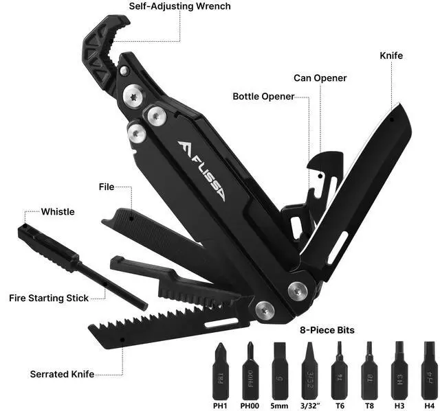 All-in-One Compact Design: This 16-in-1 multitool wrench includes a self-adjusting wrench, straight-edge knife, saw, bottle opener, can opener, file, fire starter, whistle, and 8 screwdriver bits (SL5 mm, SL3/32, PH1, PH00, H3, H4, T6, T8). Perfect for EDC, camping, hiking, or emergency use