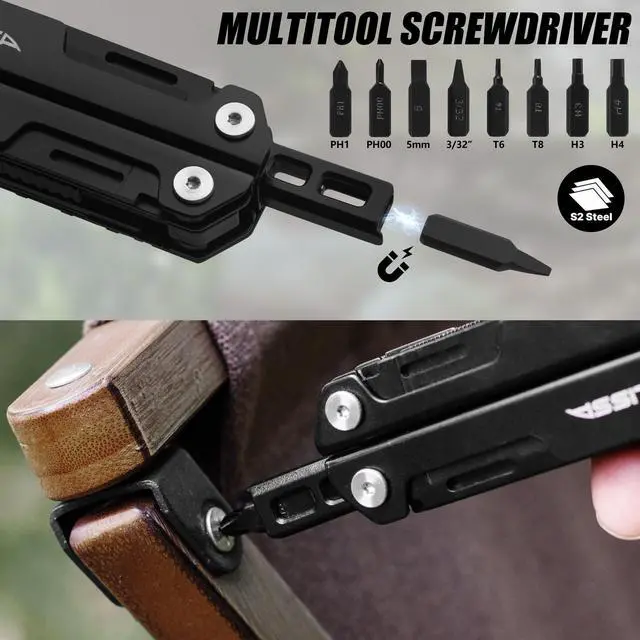 High-Quality Camping Multitool: The main tools are made of black-coated stainless steel for superior strength and rust resistance. The screwdriver bits are crafted from hardened S2 steel (HRC 5860) to ensure high torque and long-term durability