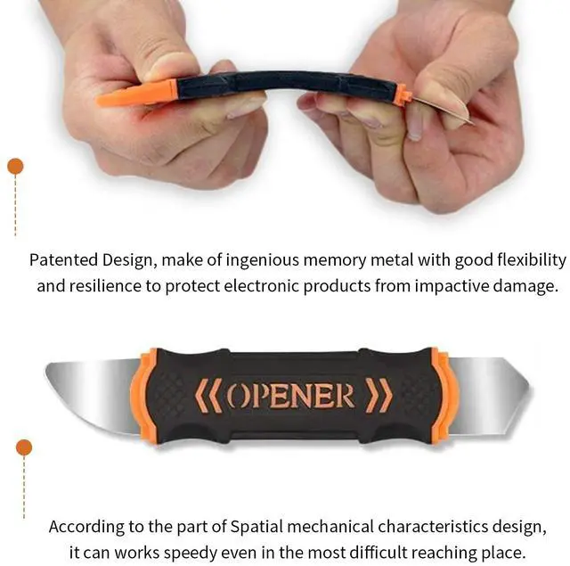 The dual-head flexible opening tool has a patent design, and the stainless steel thin blade has good flexibility and resilience, which can protect electronic products from rigid impact damage and avoid directly breaking or damaging the screen.