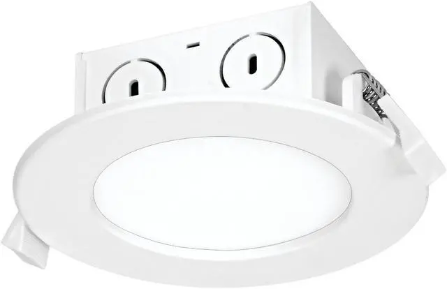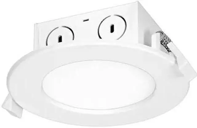 8.5 -watt, 4-inch LED (light emitting diode) direct wire downlight. Features Solid State, Edge-lit technology. Applications include residential, office, retail, hospitality, drop ceilings, and remodeling. Direct replacement for 45-watt reflector lamps, uses only 8.5 watts. Slim design. Integrated j-box for direct wire installation saves time and materials. Low profile, no recessed can required. Includes easy install spring clips. Dimmable. Damp location c-UL-us listed. 120-volt. Long life, rated for up to 40, 000 hours. Energy Star certified. 5-year warranty.
