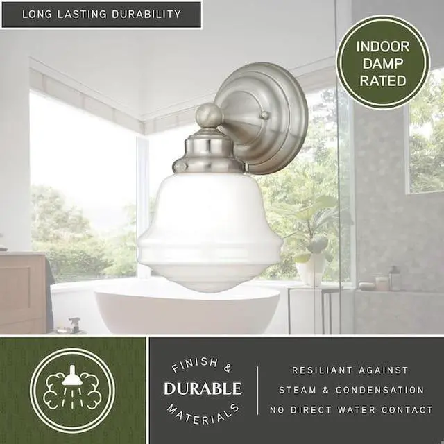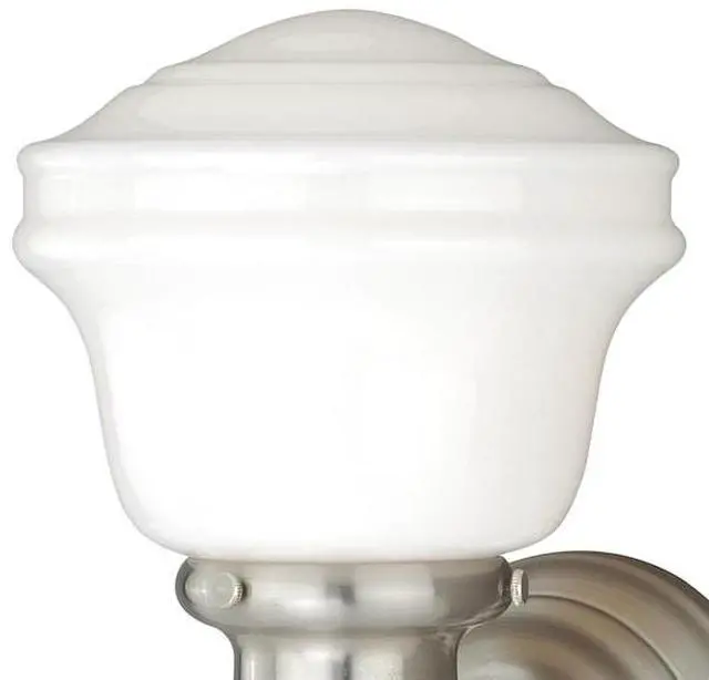 The Huntley is a timeless collection inspired by mid-century small-town aesthetics. The vintage school house glass is the focal point of this design: with its unique profile and glass options. Offered in two finishes, this versatile wall light will provide a unique accent to a variety of kitchen, dining, and bathroom settings. Medium screw base lamping provides maximum light output. Mountable in up light or down light configuration. The complete collection includes Medium Size Pendants, Semi-Flush, and 1, 2 3, and 4 Light vanities.. This item has been restricted from sale in the following state (s): []