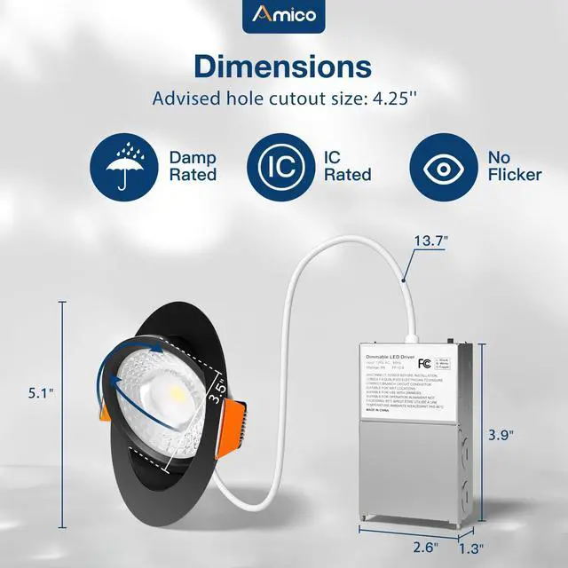 Amico Benefits: 5-Year Warranty! Its long lifespan also reduces maintenance costs. The Amico's recessed lighting are certified by ETL&FCC of a high standard. Our customer support team will also address your concerns within 24 hours.