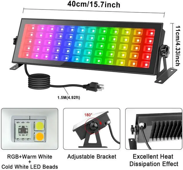 Ultra-bright LED beadsStage light bar with 3LEDs in one-row, 60 LEDs RGB, 60 LEDs warm white, 60 LEDs cole white, provides a 120-degree beam angle, a built-in reflective panel can help the LED beads emit more brightness.