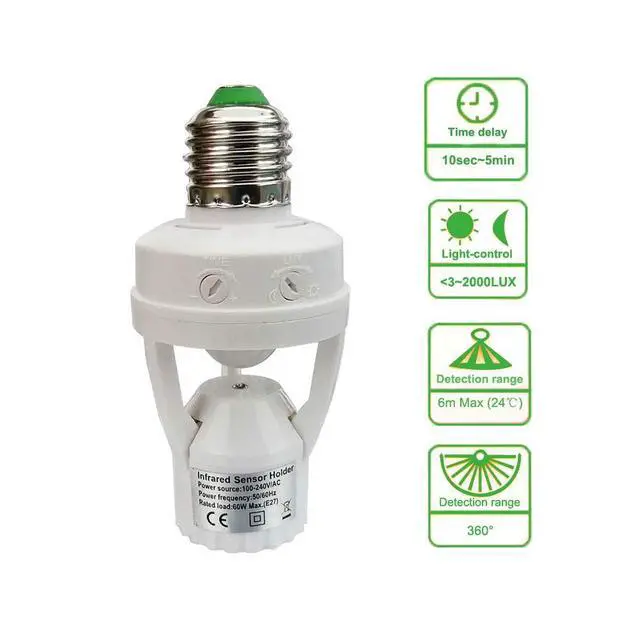 Answer: This motion sensor light socket offers 360-degree motion detection andhas a sensitivity range of up to 12 feet when mounted 8 feet above the floor. ThePIR motion light will light up automatically while the motion sensor detect motion in the detective range in the dark.