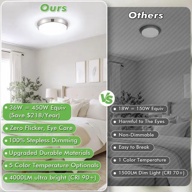 This upgraded modern ceiling light consumes only 36 watts and emits 4,000 lumens (92% less energy).