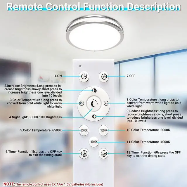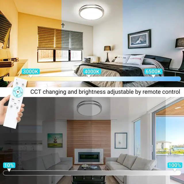The remote control lets you adjust brightness (10%–100%), change color temperature, and activate night light mode. The ceiling light also remembers your last setting when turned back on