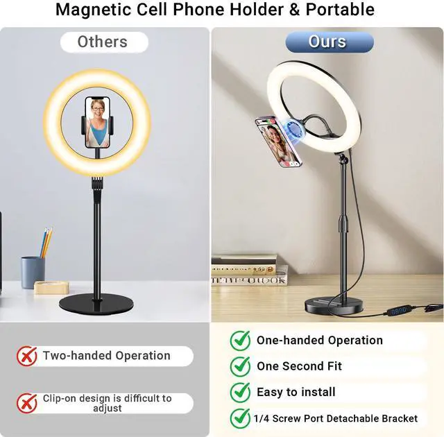 Magnetic Phone HolderUnlike a regular clip-on phone holder, the desktop circle light comes with a detachable magnetic phone holder. It can rotate 360°, operate with one hand, and hold your smartphone firmly in place in 1s. Compatible with magnetic iPhones and Android phones, it's great for zoom calls, live streaming or video recording. It can keep your device stable and at a perfect angle, ensuring you're always in the spotlight