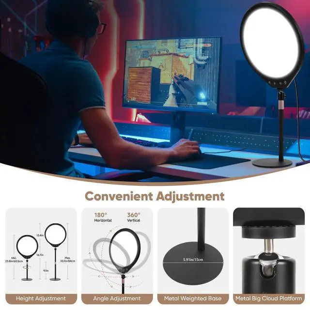 Flexible Adjustment: Made of sturdy metal, the height can be adjusted from 23 to 33 inches. The 360-degree rotating metal pan/tilt makes it easy to achieve ideal lighting. Optimized for laptops, monitors, cameras, and webcams, it effectively eliminates shadows and glare, providing professional-grade lighting effects for your office environment and video images, making it suitable for influencers, content creators, and remote workers