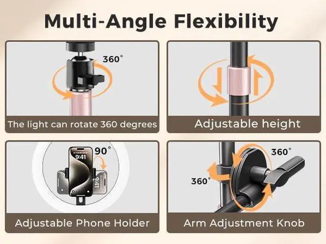 Multi-Angle Adjustment & Space-Saving Design The 360° rotating arm and height-adjustable stand (15"-50") adapt to overhead filming, desk setups, or side lighting, while the foldable base fits compact spaces like kitchen counters or small studios.