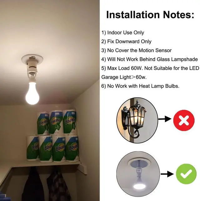 2) The motion sensor light adapter should be installed downward and no higher than 10 feet, or the sensor will not work right.It can’t be installed horizontally or facing upward.