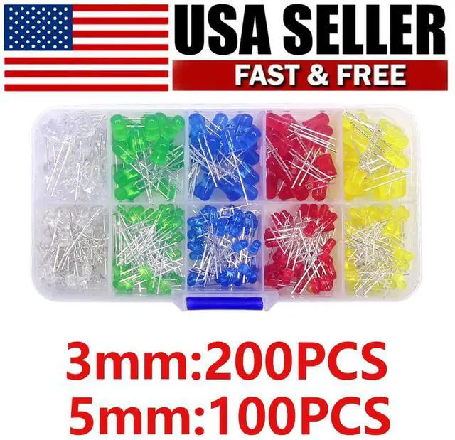300Pcs 5mm 3mm LED Light Kit Yellow White Blue Red Green Assortment with Case