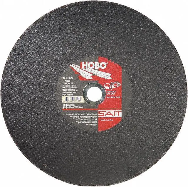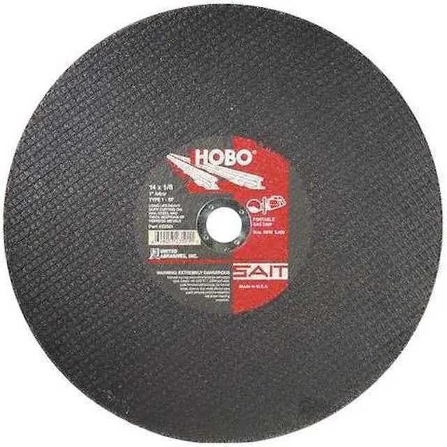 Abrasive Cut-Off Wheel, Abrasive Material Aluminum Oxide, Grit 24, Connector Size 1 in, Connector Type Unthreaded Hole, Overall Diameter 14 in, Overall Thickness 0.125 in, Compatible Tool Type High-Speed Electric Saw, High-Speed Gas Saw, Primary Material Application Steel, Series HOBO, Wheel Type Type 1, Maximum Operating Speed 5, 400 RPM, Reinforced Status Reinforced, Bond Type Resin. This item has been restricted from sale in the following state (s): []