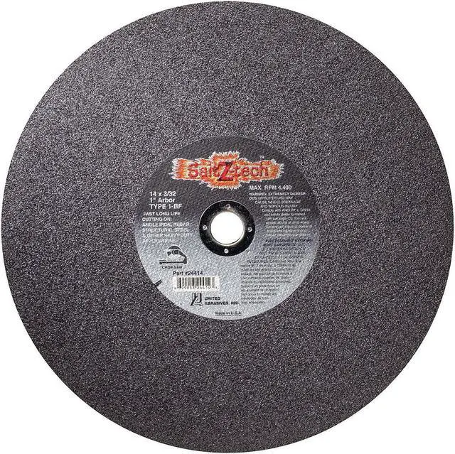 Abrasive Cut-Off Wheel, Abrasive Material Zirconia Alumina, Grit 30, Connector Size 1 in, Connector Type Unthreaded Hole, Overall Diameter 14 in, Overall Thickness 0.0938 in, Compatible Tool Type Chop Saw, Primary Material Application Stainless Steel, Steel, Series Z-Tech, Wheel Type Type 1, Maximum Operating Speed 4, 400 RPM, Reinforced Status Reinforced, Bond Type Resin. This item has been restricted from sale in the following state (s): []