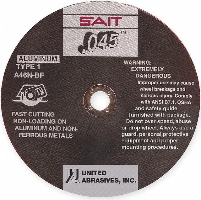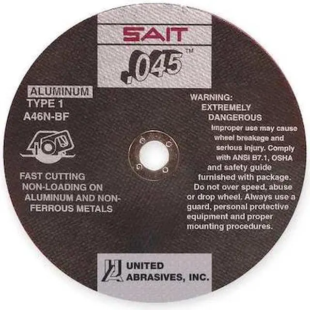 Abrasive Cut-Off Wheel, Abrasive Material Aluminum Oxide, Grit 46, Connector Size 7/8 in, Connector Type Unthreaded Hole, Overall Diameter 4 1/2 in, Overall Thickness 0.045 in, Compatible Tool Type Angle Grinder, Circular Saw, Primary Material Application Aluminum, Brass, Copper, Series A46N, Wheel Type Type 1, Maximum Operating Speed 13, 300 RPM, Reinforced Status Reinforced, Bond Type Resin. This item has been restricted from sale in the following state (s): []