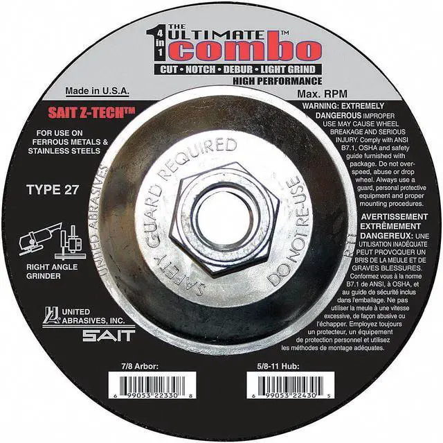 Depressed Center Cut-Off Wheel, Abrasive Material Zirconia Alumina, Connector Size 5/8 In. -11, Connector Type Threaded Hole, Grit 60, Overall Diameter 4 1/2 in, Overall Thickness 0.095 in, Primary Material Application Stainless Steel, Steel, Compatible Tool Type Angle Grinder, Series Z-Tech, Wheel Type Type 27, Maximum Operating Speed 13, 300 RPM, Grade Medium. This item has been restricted from sale in the following state (s): []