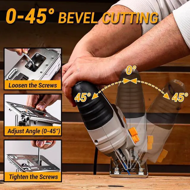 [TOOL-LESS BLADE CLAMP & BEVEL CUTTING] The electric wood cutter with the tool-less saw blade clamp, saw blades can be changed quickly without tools. Sturdy metal base plate adjusts to 0°, 15°, 30° and 45° for different bevel cutting needs.