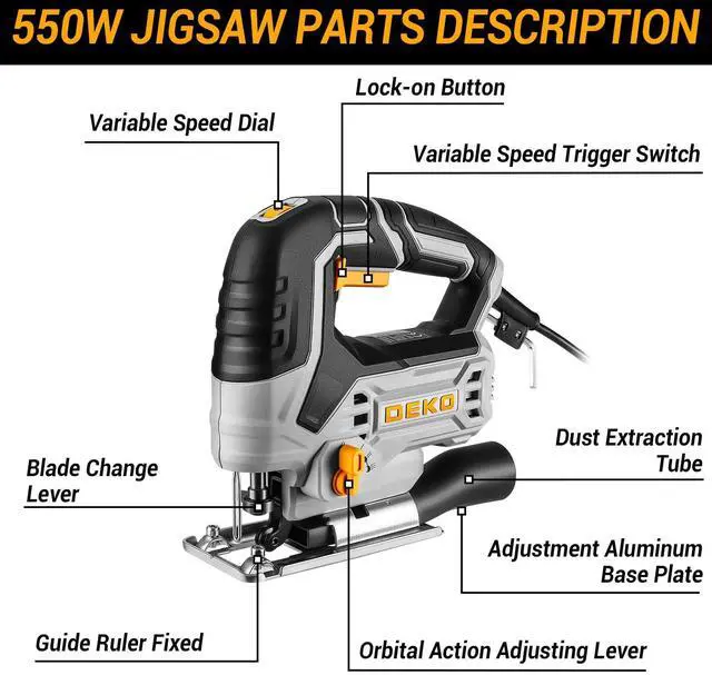 [POWER MOTOR] Max 3,000 SPM corded jig saws for all kinds of wood cutting. Featuring variable speed control that adjusts the cutting speed to suit the blade and application, the jigsaw allows for a precise finish and provides the power you need to make the majority of cuts for your DIY or beginner woodworking projects.