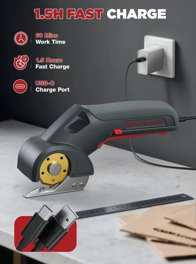 SUPERIOR CUTTING PERFORMANCE: Giosuan electric scissors combine the strength of an electric box cutter and a cardboard cutter. Equipped with a titanium-coated SKS7 blade that is 3x more wear-resistant than standard steel, it remains razor-sharp for 100,000+ cuts. Paired with a high-speed 300RPM motor, cutting power is boosted by 20% for smooth, efficient results on every project