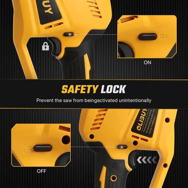 Safety & Durability AssuranceCordless sawzall featuresa safety lock mechanism and protective cover to effectively prevent accidental starts. High-quality construction ensures durability under heavy-duty use.
