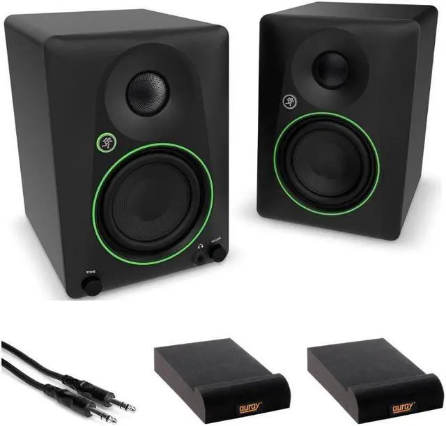 Mackie CR4.5BT, a pair of Creative Reference 4.5" Studio Monitors offering a compact solution for quality audio playback in home studios, gaming setups, and social listening events. The monitor design features an active speaker that powers the passive satellite. With 25W (per speaker) of amplification driving the 4.5" woofers and silk-dome tweeters, the CR4.5BT monitors provide full-frequency playback with plenty of volume to fill your studio or living area. With a selection of inputs, Bluetooth audio streaming, and switchable Desktop and Bookshelf modes, the CR4.5BT speakers provide clear and powerful sound in any space. The onboard tone control provides transparent, studio-quality sound and can add more excitement with optional hyped bass and added sparkle. Whether youre using them for business, pleasure or both, Mackie CR4.5BT may be the only speakers you ever need. Bundle with Hosa Stereo 1/4" Male Phone to 1/4" Male Phone TRS Cable 10, Auray IP-S Isolation Pad for Studio Monitor (2-Pack).