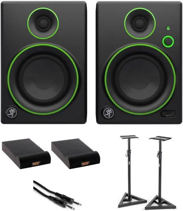 Mackie provides audio playback in home and studio environments. As such, they are useful for mixing music or post-production sound, and they boast Bluetooth capability to boot. The pair consists of one Class AB amplifier-powered monitor and a passive un-powered monitor that you can connect with an included stereo cable. For the low-end, these speakers utilize 4" polypropylene-coated woofers and a rear port tube, while the highs are handled by 0.75" silk dome tweeters; all of this ensures a frequency response of 70 to 20,000 Hz with a maximum SPL of 100 dB. A switch allows you to select whether the powered speaker will function as the left or right monitor. This is particularly helpful when you must position the speakers near power outlets, or when you have to decide whether you'd rather have your front-panel volume knob situated on your left or right. Bundle with On-Stage SMS6000-P Studio Monitor Stand, Auray IP-S Isolation Pad for Studio Monitor (2-Pack), Hosa Stereo 1/4" Male Phone TRS Cable 10.