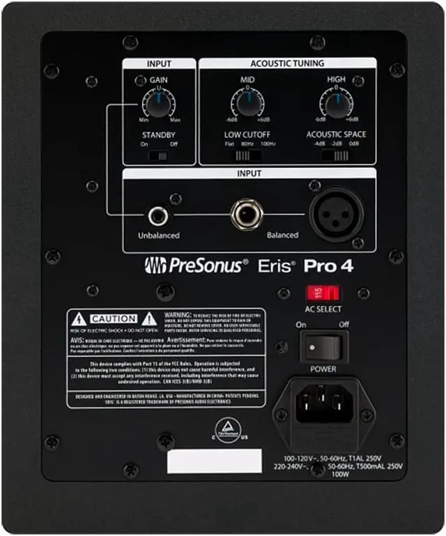 Its 1-inch ultra-low mass silk-dome tweeter ensures snappy, accurate transient reproduction, while the 4.5 -inch woven-composite woofer delivers tight, clear bass with plenty of punch and no unwanted flabbiness. The ported enclosure, combined with 80 watts of power, allows the Eris Pro 4 to reach frequencies as low as 50 Hz. Acoustic tuning controls are included to tailor the Eris Pro 4 to your specific room acoustics, and the three-way Acoustic Space tuning compensates for the effects of speaker placement against walls or in corners. With flexible input options, you can easily connect almost any line-level source, from mixers to audio interfaces and more, ensuring seamless integration with your existing audio setup.