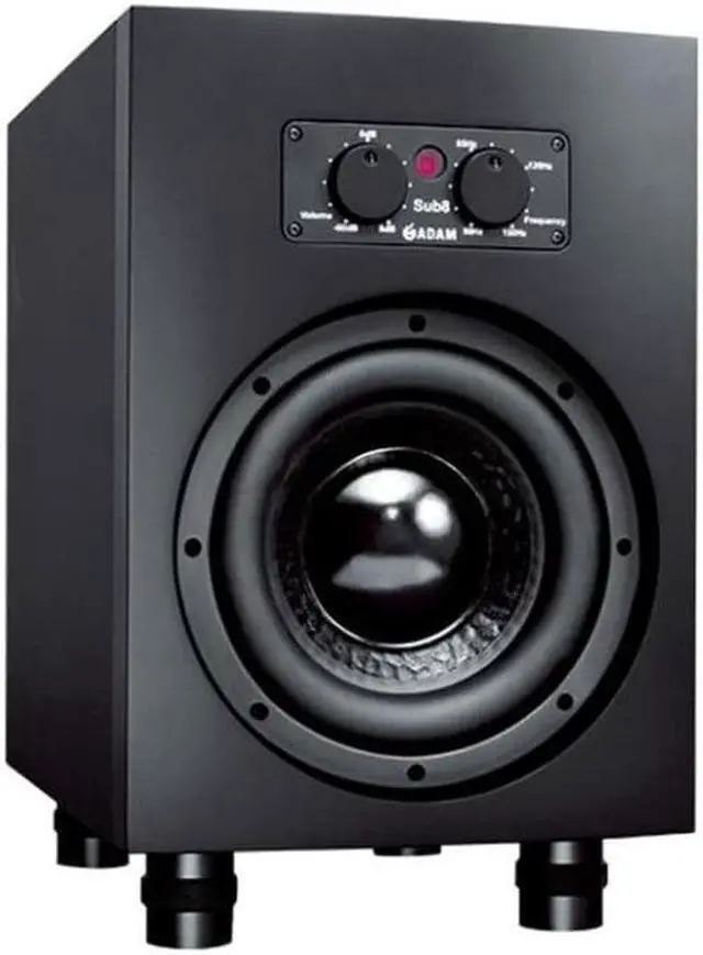 The Sub8 is a small yet powerful subwoofer designed to extend the low-frequency capabilities of any nearfield monitoring system down to 30Hz. It houses a robust 8.5-inch woofer with a 1.5-inch voice coil driven by a 160W ICE power amplifier. This amp combines low heat generation with high performance to handle maximum power levels, even during long mix sessions. The front baffle features two motorized knobs that let you tailor input level and crossover frequency settings. These settings can also be controlled via the included wireless remote, allowing you to optimize your sound reproduction from your ideal listening position. The Sub8 is designed for smaller rooms up to 20 square meters. It is an ideal match for the ADAM Audio AX-Series and the S2V nearfield monitors.