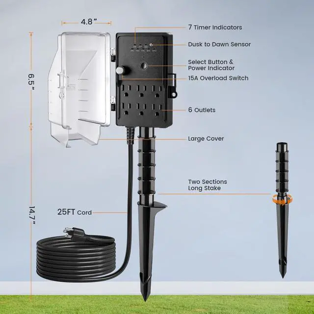 This outdoor power stake timer features 6 grounded outlets controlled simultaneously, perfect for powering multiple devices. It serves as an outdoor plug extension cord, ideal for holiday setups like Christmas lights and Halloween decorations, allowing you to connect all your decorations at once.