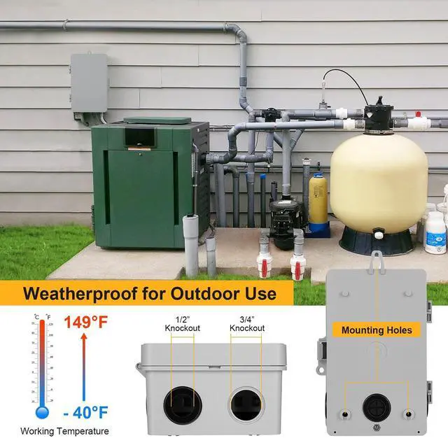 This rain and rust-proof heavy-duty outdoor timer box is made of durable insulating and flame-retardant material. Designed specifically for outdoor applications, dynamic weather conditions and ease of use rain-tight cover protects the pool timer from any weather conditions. This pool electrical box case is resistant to UV damage and keeps the timer switch clean and dry so it will last for years to come.