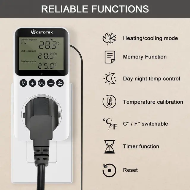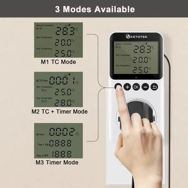 - 3 modes to choose from: M1 TC mode (temperature control), M2 TC+Timer mode( temperature control with day/night timer), M3 Timer mode
