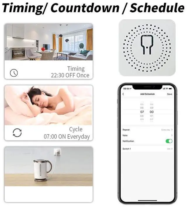 [Schedule and Timer]: Enjoy your customized schedule to automatically power on or off any electronic device. Such as turn on the light in the morning and turn it off at night, disconnected the pone within 30 minutes and so on.