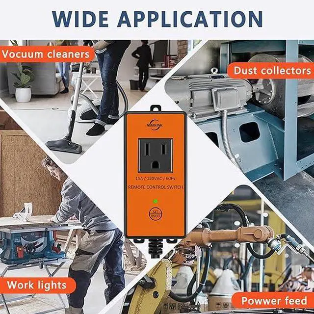 Remote remotes are capable of controlling multiple vacuum remote switched outlet units simultaneously. They are suitable for vacuum cleaners, dust collector, track saw,miter saws, table saws power supplies, work lights, air compressors and various other tools. The remote control signal can penetrate walls. If there is no obstruction, the signal can be transmitted up to 50 meters.