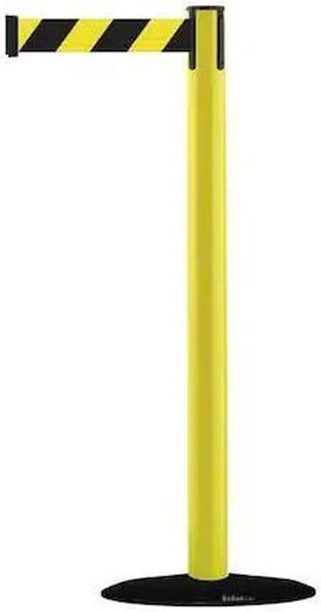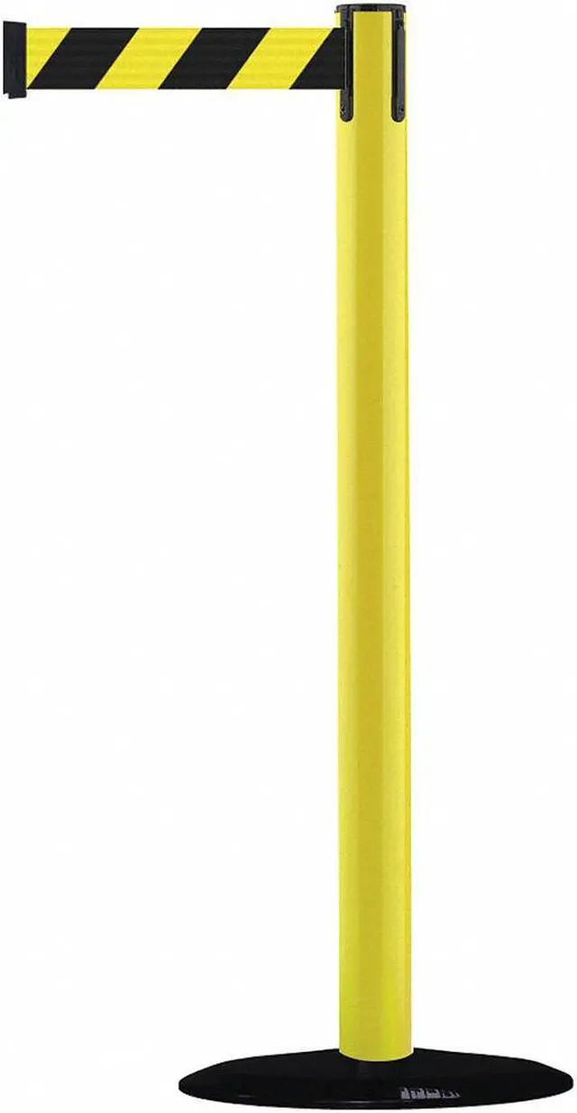 Barrier Post with Belt, Post Material PVC, Post Finish Yellow, Post Height 38 in, Post Dia. 2 1/2 in, Base Type Basic, Base Dia. 14 in, Base Material Steel, Base Finish Black ABS No Scuff Cover, Number of Belts 1, Belt Length 7 1/2 ft, Belt Color Black and Yellow Diagonal Striped, Belt Width 2 in, Indoor, ADA Compliance Yes