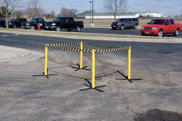 Barrier Post with Belt, Maximum Overall Height 38 in, Legend No Legend, Legend Color Not Applicable, Number of Belts 1, Belt Length 13 ft, Belt Width 2 in, Belt Color Black/Yellow, Belt Pattern Chevron, Post Color Yellow, Product Type Stanchion, Includes (4) Posts, Carry Bag, Minimum Overall Height Not Applicable, Post Diameter 2 1/2 in, Post Material Vinyl, Post Finish Yellow, Base Type Cross, Base Diameter 145 1/2 in, Base Material PVC, Base Finish Black, Base Color Black, ADA Compliance No.