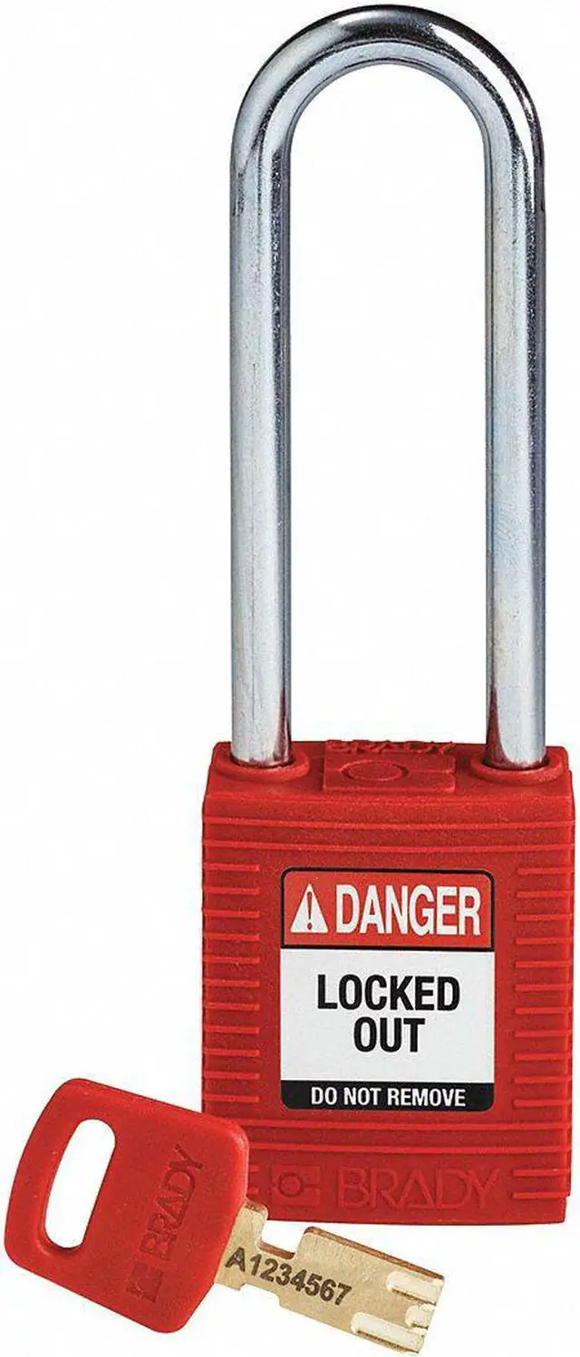Lockout Padlock, Body Color Red, Body Height 1 13/16 in, Body Material Nylon, Body Thickness 3/4 in, Body Width 1 1/2 in, Header Danger, Horizontal Shackle Clearance 13/16 in, Key Style Linear, Key Type Keyed Different, Non-Removable Key Yes, Resistance Properties Not Applicable, Shackle Diameter 1/4 in, Shackle Height 3 in, Shackle Material Steel, Shackle Type Extended, Vertical Shackle Clearance 3 in, Width Across Shackle 13/16 in, Body Material Coating Thermoplastic, Body Shape Rectangular
