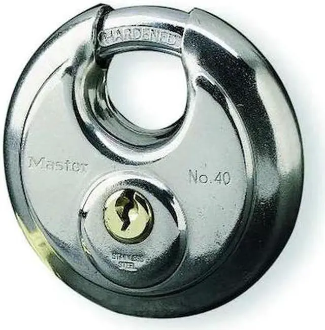 Padlock, Shackle Dia. 3/8 in, Shackle Height 5/8 in, Shackle Width 3/4 in, Shackle Material Steel, Body Width 2 3/4 in, Body Thickness 7/8 in, Body Material Stainless Steel, Number of Bumpers 0, Number of Pins 4 Pin, Key Type Alike, Control Key Registration Required No, Opens with Key No. 501, Body Color Silver, Body Dia. 2 3/4 in, Keyway Type Master K1, Weather Resistant Yes, High Security No, Interchangeable Core No, Padlock Body Shape Disc, Rekeyable No, Shackle Type Partially Hidden Shackle