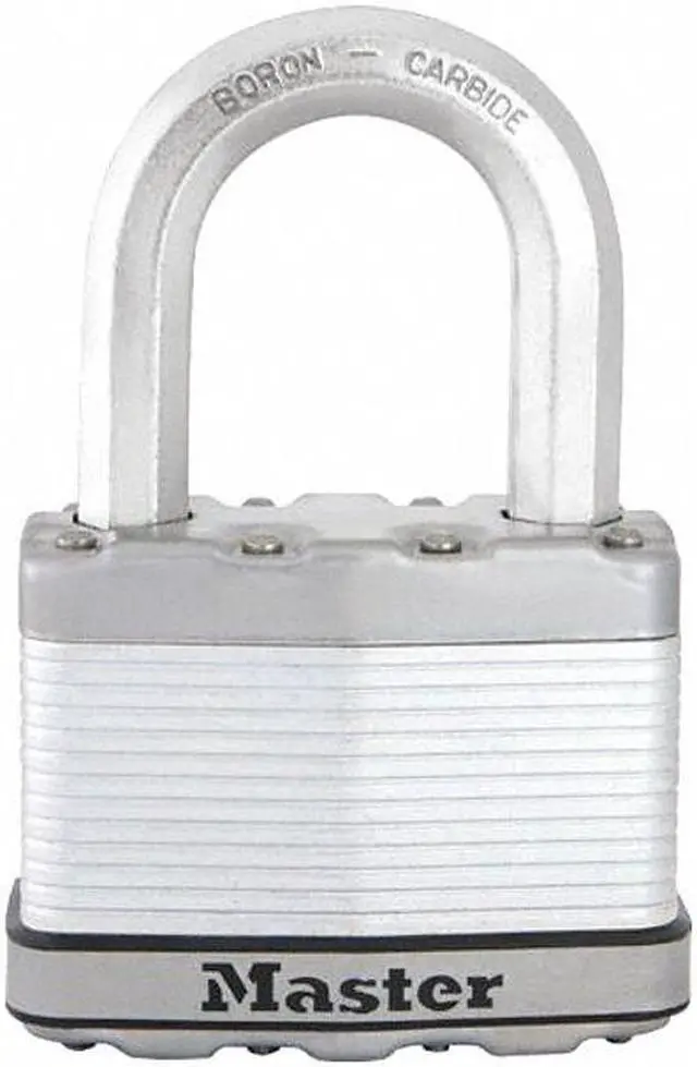 Padlock, Shackle Dia. 7/16 in, Shackle Height 1 1/2 in, Shackle Width 1 3/16 in, Shackle Material Boron, Body Height 3 57/64 in, Body Width 2 1/2 in, Body Thickness 1 19/64 in, Body Material Steel, Number of Bumpers 1, Number of Pins 5 Pin, Key Type Different, Control Key Registration Required No, For Use With Lockout/Tagout, Security, Body Color Silver, Body Dia. 2 1/2 in, Body Finish Laminated, Keyway Type Master K1, Weather Resistant No, High Security Yes, Interchangeable Core No