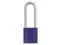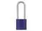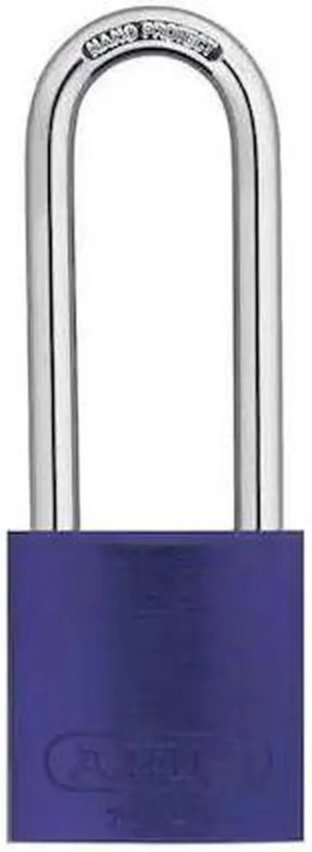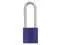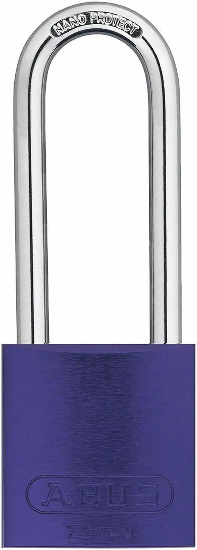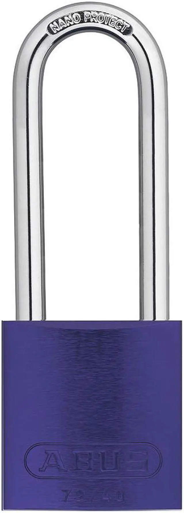 Keyed Padlock, Key Type Alike, Body Material Aluminum, Shackle Dia. 1/4 in, Shackle Height 3 in, Shackle Material Chrome Plated Hardened Steel, Shackle Width 13/16 in, Body Width 1 1/2 in, Body Thickness 3/4 in, Includes Two Keys, Body Height 1 5/8 in, Body Color Purple, Shackle Type Open, Number of Bumpers 0, Control Key Registration Required No, Package Quantity 6. This item has been restricted from sale in the following state (s): []