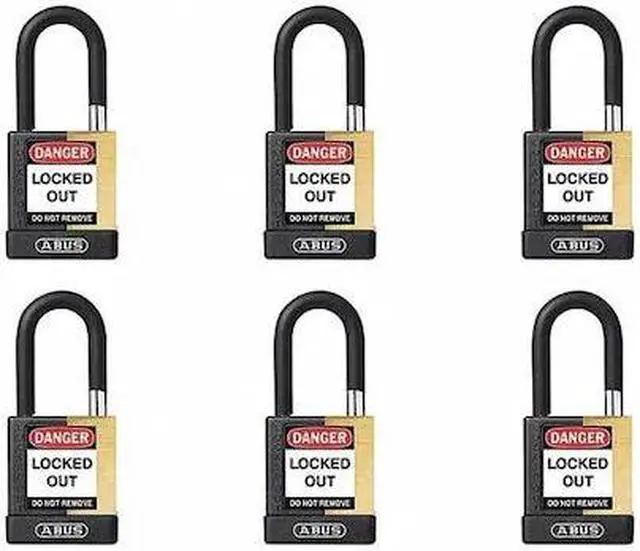 California Proposition 65: This product contains a chemical known to the State of California to cause birth defects or other reproductive harm. Keyed Padlock, Key Type Alike, Body Material Brass, Shackle Dia. 1/4 in, Shackle Height 1 1/2 in, Shackle Material Plastic Encased Hardened Steel, Shackle Width 3/4 in, Body Width 2 in, Body Thickness 3/4 in, Includes (2) Keys, Body Height 1 3/4 in, Body Finish Powder Coated, Body Color Black, Shackle Type Open, Number of Bumpers 0, Control Key Registration Required Yes, National Stock No. No, Package Quantity 6. This item has been restricted from sale in the following state (s): []