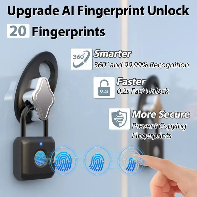 Fast Fingerprint Unlock No keys,No passwords,Your Finger is the Key!High fingerprint recognition rate of 99% and quick unlock in 0.2 seconds. Can record up to 20 different fingerprints including 2 admin fingerprints. Fingerprints to be registered via the eSmartLock APP, only admin can reset or manage it.
