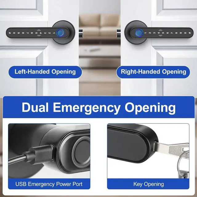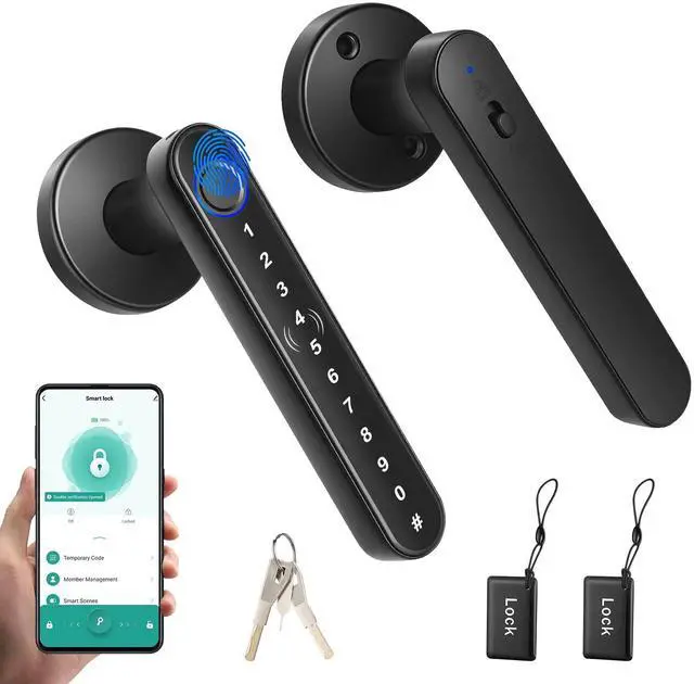 • 5-in-1 Keyless Entry Smart Handle Lock: Unlock your door effortlessly via Fingerprint, Code, Key, Card, or Tuya Smart App. This Electric Finger Print Doorknob ensures everyone, from kids to elderly parents, can choose their preferred and most convenient method. Say goodbye to fumbling for keys in the dark or worrying about lost copies.