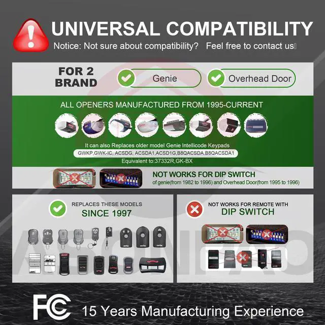 Wide CompatibilityUniversal for all Genie & Overhead Door Legacy Python Odyssey Destiny Phantom Garage Door Opener Since 1995. Not Support Dip Switch Opener!