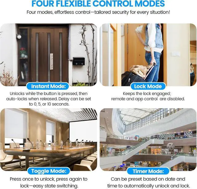 FOUR FLEXIBLE CONTROL MODES: In Instant Mode, pressing the remote control immediately unlocks the device, and it can be set to automatically lock after a delay of 0, 5, or 10 seconds. In Lock Mode, operation via the remote control or App is disabled. In Switch Mode, a single press unlocks, and pressing again locks. The newly added Timer Mode allows presetting based on date and time to automatically lock and unlock, achieving intelligent management.