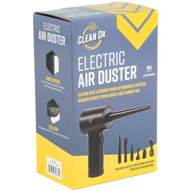Clean your computer, keyboard, desk and accessories with the Digital Innovations Electric Air Duster and never have to worry about buying compressed air again. The Digital Innovations Electric Air Duster is USB rechargeable and features three selectable airflow speeds. The air duster is equipped with an LED light for use in low light conditions and includes five multifunctional nozzle options. Clears dust and debris to keep your work space clean Adjustable for three different airflow speeds Five multifunctional nozzle options for optimized cleaning USB Rechargeable electric air duster reduces waste vs. single-use canned air Rechargeable battery lasts over 20 minutes Convenient integrated LED lighting for use in low light conditions Fill inflatables with included inflation nozzle
