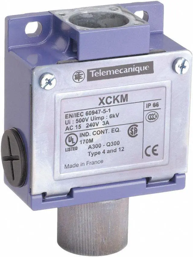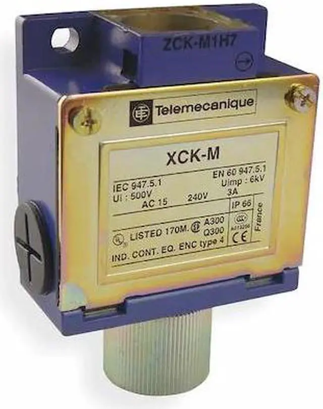 Limit Switch Body, Contact Form 1NO/1NC, For Use With XCKM Series Limit Switches, AC Contact Rating 3 A @ 240 V, NEMA Rating 1, 12, 2, 3, 4, Electrical Connection Screw Clamp Terminals, IP Rating IP66, Operating Temp. -13 Degrees to 158 Degrees F, Standards CE, CSA, EN/IEC 60947-5-1, UL Listed. This item has been restricted from sale in the following state (s): []